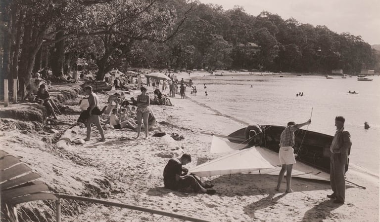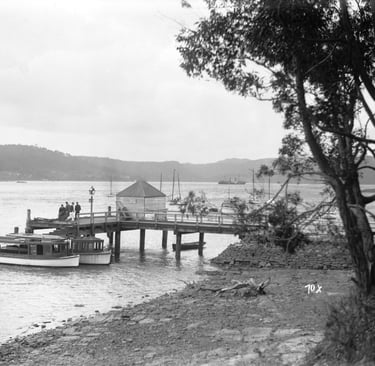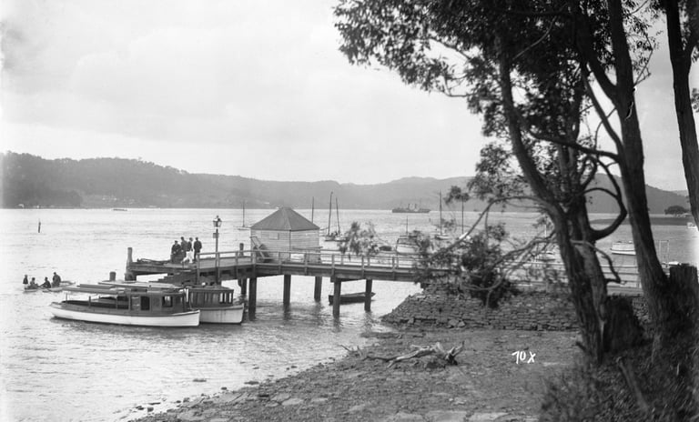 Next, a 1920s panorama of Careel Bay jetty: excursion boats bobbing at the end, families spilling from launches onto the wharf for dances and dips, the estuary a mirror of masts and mangroves – early days of the boating boom, with the first private jetties peeking like promises. You can hear the horns and laughter. (National Library of Australia; search “Panorama Careel Bay 1920s” for the wide-angle wonder.)